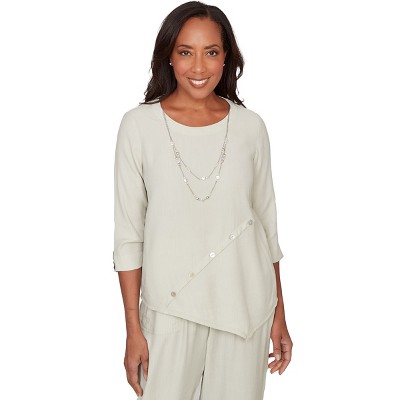 Alfred Dunner Womens Petite Paisley Swirl Sharkbite Hem Top With Necklace, Blue, Size PXL