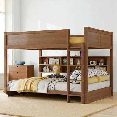 Mshliw Queen Over Queen Solid Wood Bunk Bed with Storage Cabinets, Ladder, Guardrails and Built-in Charging Station