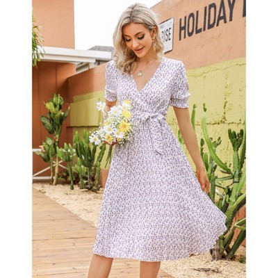 Coolmee Women's Dress Floral Wrap V Neck Pleated Dress Short Lantern Sleeve Flowy A Line Midi Dress with Belted
