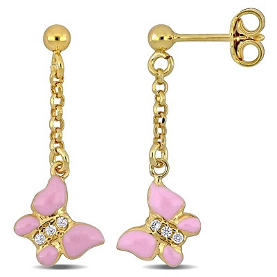EVERLY JEWELRY | Yellow Silver Cubic Zirconia Pink Enamel Butterfly Drop Earrings