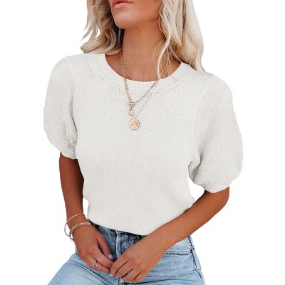 Coolmee Women's Summer Sweater Crew Neck Dressy Puff Sleeve Casual Soft Knit Pullover Tops