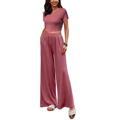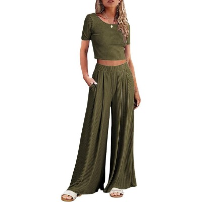 Ekouaer Women's 2 Piece Lounge Sets Short Sleeve Pajama Set Ribbed Knit Crop Top Wide Leg Pants Loungewear
