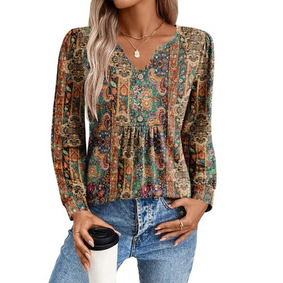 Zeagoo Long Sleeve Shirts for Women Casual Pleated V Neck Fall Tunic Tops Button Down Blouse Dressy Loose T-Shirts-MZ721-XL