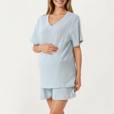 Anna-Kaci Women's 2-Piece Set Maternity V-Neck Short Sleeve Pajama Top with Relaxed Fit Shorts