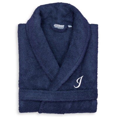 Linum Home Textiles 100% Turkish Cotton Unisex Personalized Terry Bathrobe Navy in White Script Font