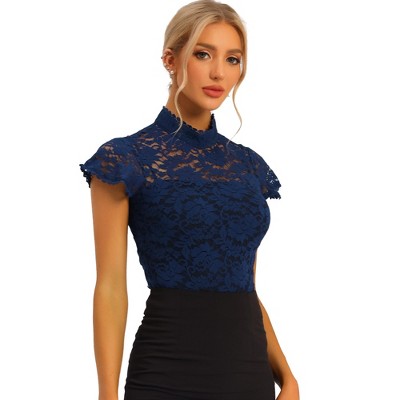 INSPIRE CHIC Women's Elegant Floral Lace Short Sleeve Keyhole Back Semi-Sheer Top