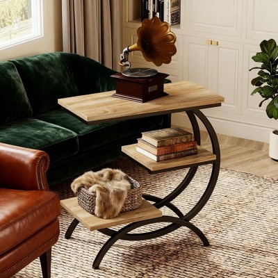 Gulches C-Shaped End Table (Light Brown) Industrial 3-Tier Small Side Table with Storage Shelves for Couch Living Room Small Space