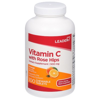 Leader 500 mg Orange Flavor Vitamin C with Rose Hips 100 Chewable Tablets
