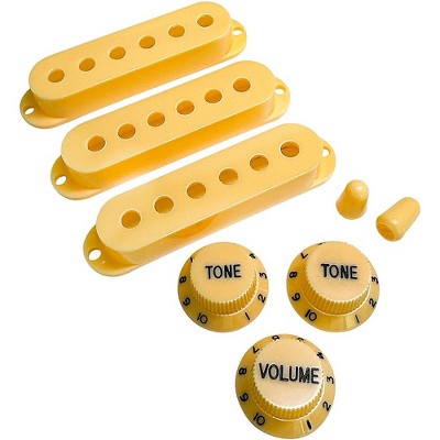 AxLabs Set Of Single Coil Pickup Covers In Vintage Spacing (52mm), Two Switch Tips, And Three Knobs (Black Lettering)