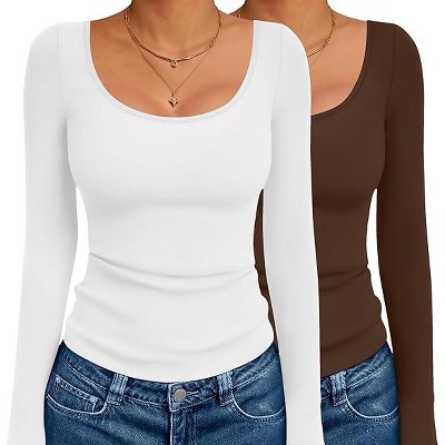 Ekouaer 2 Pack Long Sleeve Shirts for Womens Scoop Neck Tops Slim Fit Undershirts Basic Thermal Tee Shirt