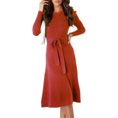 Clearlove Women's Ribbed Knit Midi Dress Long Sleeve Belted Tunic Sweater Dress with Belt Casual Cocktail Party Dress