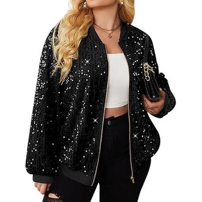 Zeagoo Womens Sequin Jacket Plus Size Sparkle Long Sleeve Jackets Front Zip Loose Casual Blazer Bomber Jacket with Pockets