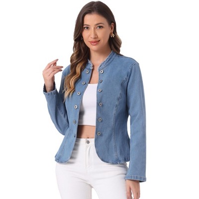 Allegra K Women's Turn Down Frayed Button Down Washed Cropped Denim Jacket