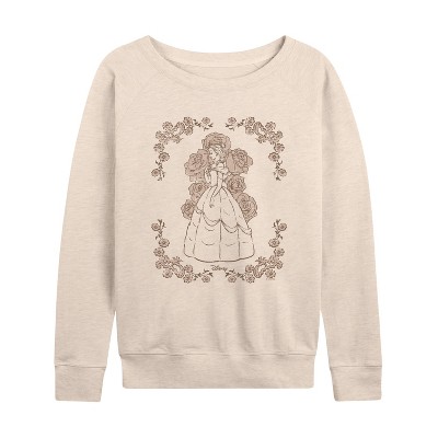 Women's Disney Princess Belle Roses Lightweight French Terry Wide Neck Long Sleeve Graphic Shirt - Birch - 1X