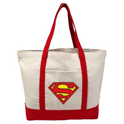 Superman Classic SShield Logo Canvas Tote Bag With External Pocket, Reusable Shoulder Bag for Shopping, School, Beach, Red