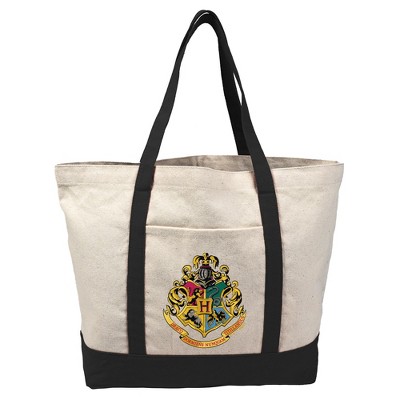 Harry Potter Hogwarts School Crest Canvas Tote Bag With External Pocket, Reusable Shoulder Bag for Shopping, School, Beach, Black