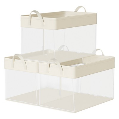 Set of 3 Large Fabric Storage Bins with Transparent Mesh, 19.7x11.8x11.8 Inch Foldable Organizers with Handles, Cream White