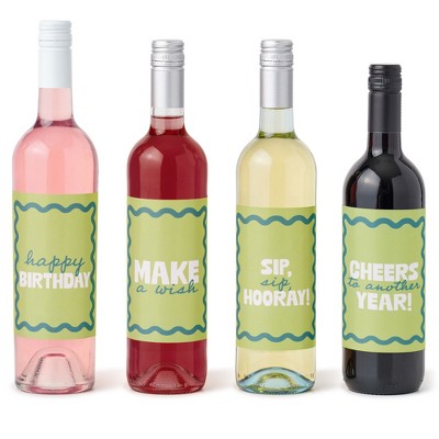 Big Dot of Happiness Light Green and Teal Wavy Birthday Wine Labels for Bottles, Retro Party Decorations, Pink Wine Bottle Label Stickers - Set of 4