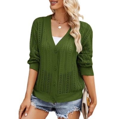 Casual Openwork Knit Long-Sleeve Cropped Cardigan for Women