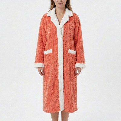 Anna-Kaci Lounge Women's Plush Bathrobe with Textured Cable Pattern Contrast Plush Trim Button Front Closure and Pockets