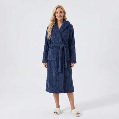 Anna-Kaci Lounge Women's Plush Hooded Bathrobe with Textured Cable Pattern Long Wrap Design Adjustable Waist Tie and Front Pockets