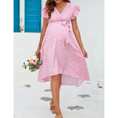 Women's Maternity Boho Ruffles Short Sleeve Dress Floral Smocked Scoop Neck Midi Dress for Baby Shower Photoshoot