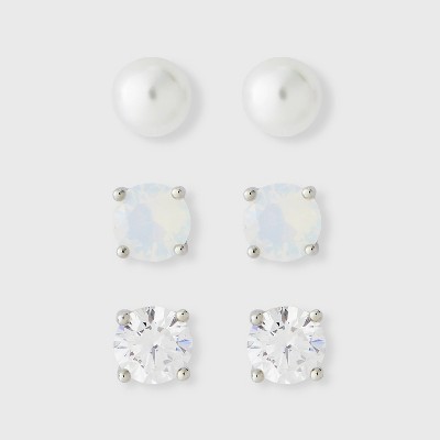 Silver Plated Cubic Zirconia Glass Pearl & Opalite Stud Post Earring Set 3pc - A New Day™