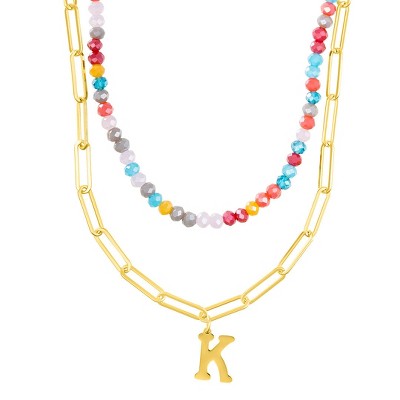 Adornia 14k Gold Plated Adjustable Layered Color Beads and Paperclip Chain Initial Necklace