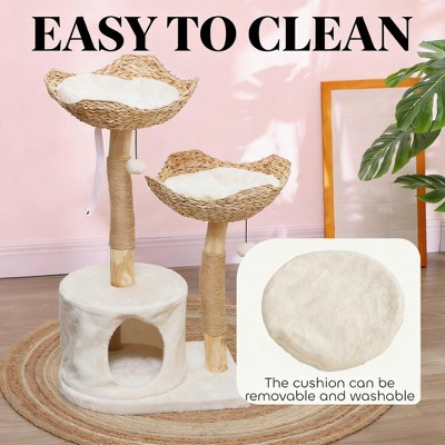PawHut Cattail Weave Cat Tree for Indoor Cats Kitty Tower with Rattan Cat Condo, Wicker Bed, Ladder, Washable Cushions, 22.5" x 14.5" x 39.5", Natural