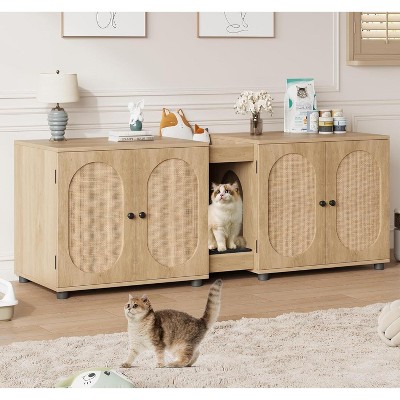 Large Cat Litter Box Enclosure Furniture, 55.1" Double Litter Cabinet for Two Cats with Hidden Design, Rattan Door Cat Box House with Storage, Wood