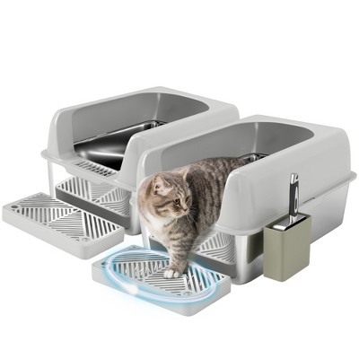 Covered Stainless Steel Kitty Litter Pan, Spill-Proof Metal Feline Toilet with High-Wall Enclosure, Odor-Free Washroom Set with Tracking Pad & Sifter