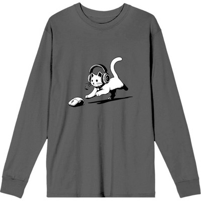 Gaming Cat Chasing Computer Mouse Adult Crew Neck Long Sleeve Tee