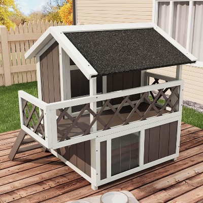 DobleePy White & Gray Outdoor Cat House, Weatherproof & Insulated, 2-Tier Wooden Cat Shelter with Balcony & Asphalt Roof for Cats & Small Animals