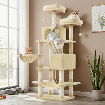 64.6 Inches Large Cat Tree Tower, Tall Cat Activity Center with Hammock, Basket, and Removable Fur Ball Sticks, Cat Condo Cat Houses for Indoor Cats