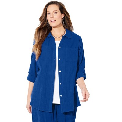 Catherines Anywear Pucker Cotton Buttonfront Roll Tab Shirt