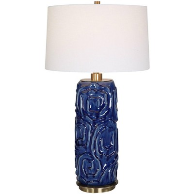 Uttermost Modern Coastal Table Lamp 28 1/2" Tall White Indigo Striped Glaze Ceramic Linen Drum Shade for Living Room Bedroom House