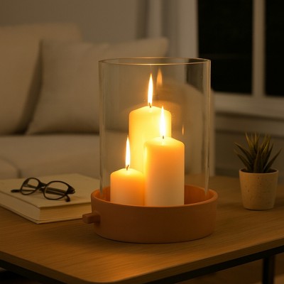 Glass Hurricane Candle Holder with Terracotta Base - Decorative Pillar Candlestick Holder for Dining Table Centerpiece or Shelf Display