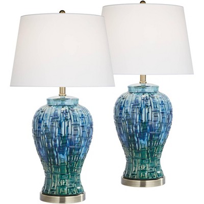 360 Lighting Aegean 28" Tall Coastal Modern Table Lamps Set of 2 Blue White Finish Ceramic Beige Shade Living Room Bedroom Bedside Nightstand House