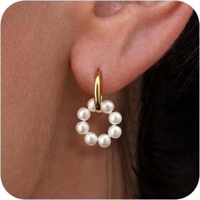 Pearl Earrings for Women, Trendy 14k Gold Pearl Dangle Drop Hoop Huggies Earrings Cubic Wedding Gold Earrings