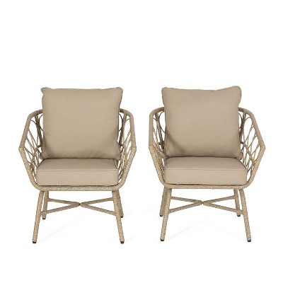 GDFStudio Colmar Outdoor Wicker and Iron Club Chairs with Cushions (Set of 2), Light Brown/Beige
