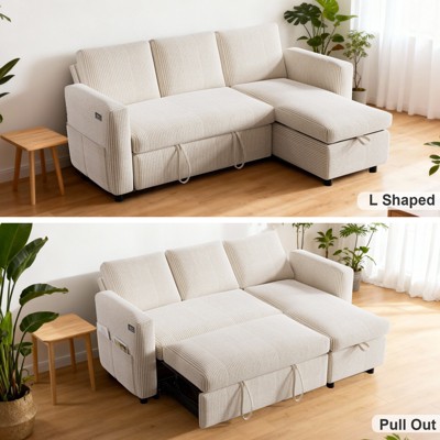 Vipbear Corduroy/Chenille Sleeper Sofa Couch Pull Out Couch with Reclining Backrest/Reversible Storage Chaise/USB Ports/Tool-Free Assembly