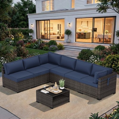 UPTIOT All-Weather Patio Set with 4 Side Chairs, 2 Corner Loungers & Coffee Table - Modular Design for Flexible Outdoor Spaces,Blue