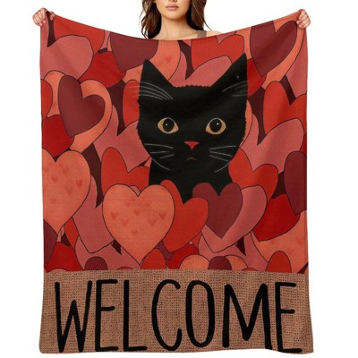 Valentine's Day Black Cat Hearts Welcome Throw Blanket - Ultra Soft, Anti-Pilling for Couch & Gifting 30x40 inches