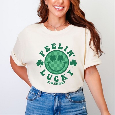 S.W.Smiley Feelin Lucky Checkered Smiley Face - Women's Garment Dyed Graphic T-Shirt