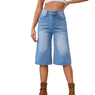 Coolmee Women's High Waisted Jean Shorts Baggy Straight Leg Stretchy Denim Cropped Pants Casual Wide Leg Jeans