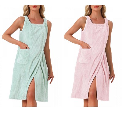 INSPIRE CHIC Women's 2 Pcs Shower Wrap Wearable Button Bath Towel Robe Sleeveless Snap Dress with Pockets