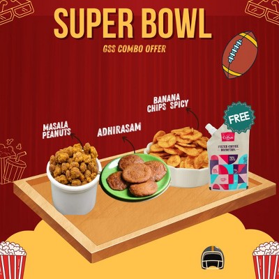 Shastha Super Bowl Snacks & Sweets GSS Combo- GSS Nendhiram Chips Spicy, Masala Peanuts, Athirasam + Free 200 ML cothas Coffee Decoction - Pack of 4