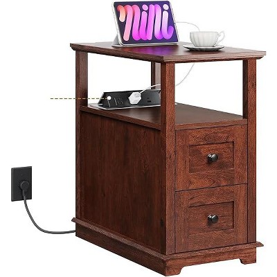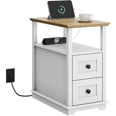 DEXYLLO Narrow Side Table with Charging Station, Wooden End Table with 2 Drawers, End Tables Living Room, Bedroom, Small Space