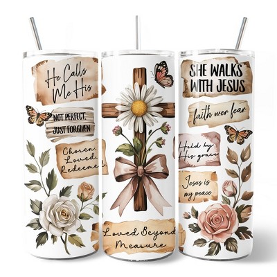 Boho Christian Cross 20oz Personalized Tumbler With Lid and Stainless Steel Straw, Vintage Floral Quotes Gift Cup (NON-CUSTOM) | OrnamentallyYou