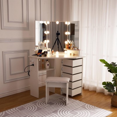Makeup Vanity Desk - Vanity Desk Set with Lights & Power Outlet Corner Vanity Table with 5 Rotating Drawers 3 Lighting Mode